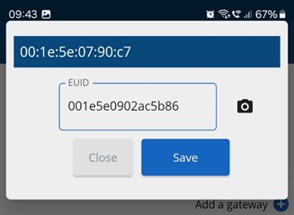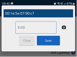 - Skann QR-koden på gatewayens etikett. Når dette er gjort, vil EUID-feltet fylles ut automatisk. Klikk Lagre.