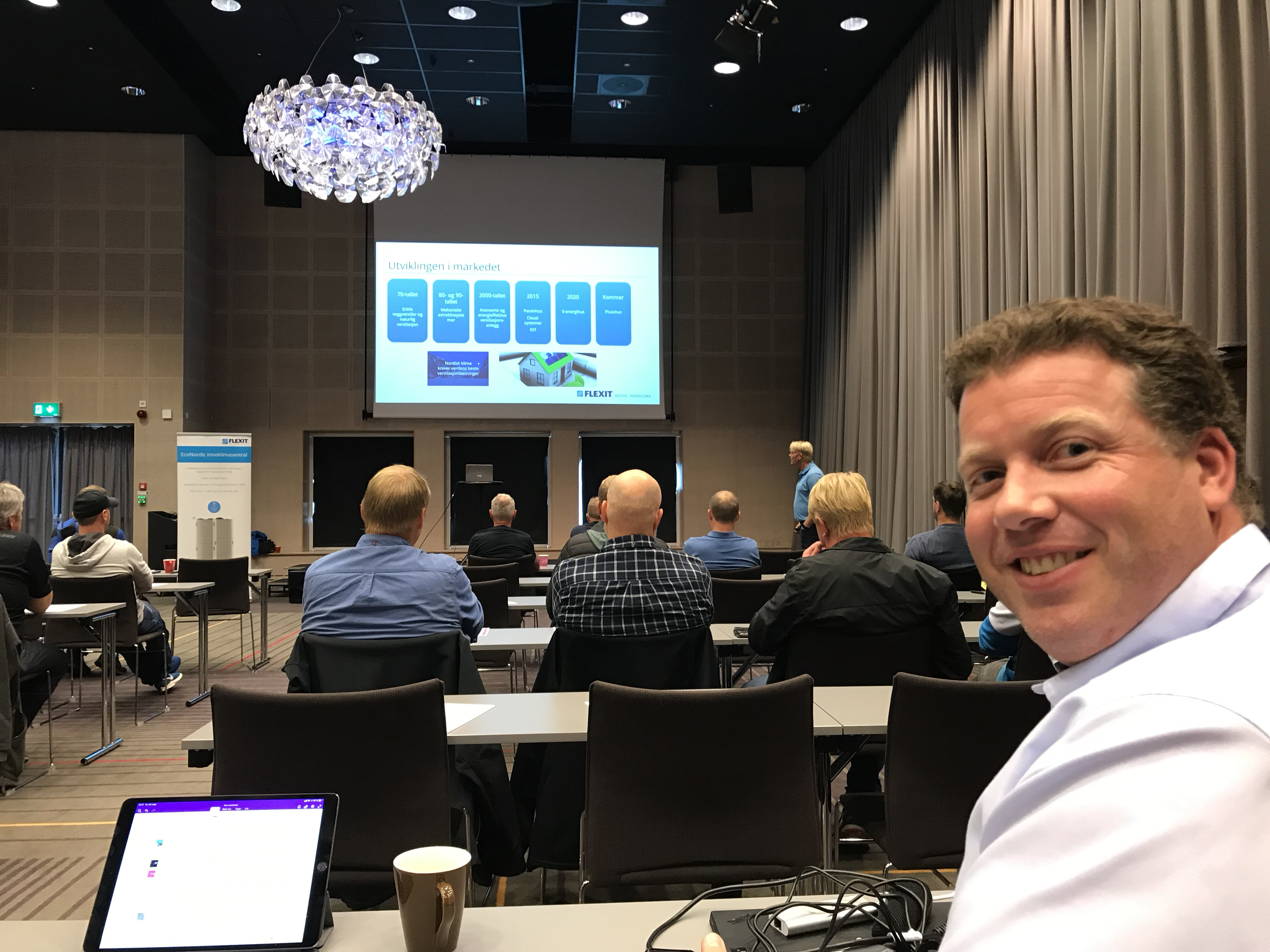 Eivind Kolstad, partneransvarlig i Flexit, presenterte bl.a. hvordan man enkelt kan gjøre energiberegninger iht. NS3031:2014, og hvordan man kan redusere energibehovet ved å benytte korrekt utstyr for ventilasjon og oppvarming. Flexits EcoNordic WH4 er en inneklimasentral med integrerte funksjoner for balansert ventilasjon, tappevann og varme til boliger. Den sikrer et sunt inneklima, rikelig med varmtvann og varme på en svært energieffektiv måte